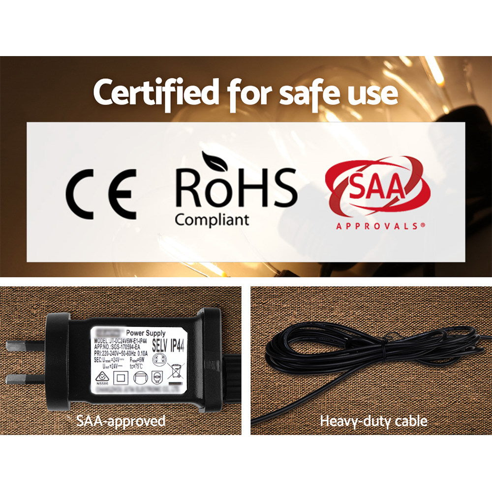 Our Jingle Jollys Festoon String Lights are great not only for wedding and birthday parties or special events, but also for creating a warm, inviting ambience with its bright and mellow glow. Suitable for both indoor and outdoor use, its IP44 rating means that it can be used in the rain and all weather conditions. Each bulb draws a very low voltage and is placed 90cm equally apart from each other throughout its 68m length for an even distribution of illumination and brightness. Not least, the each bulb has a 20,000 hours lifespan so that you can get to use the string lights for quite a while.
