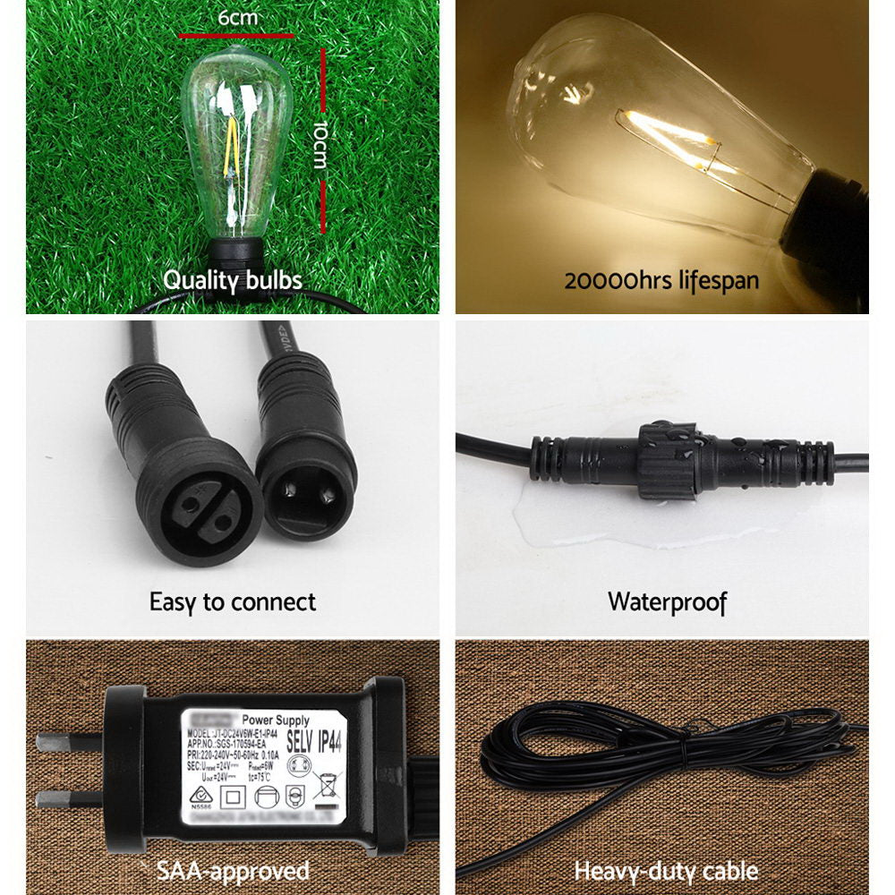 Our Jingle Jollys Festoon String Lights are great not only for wedding and birthday parties or special events, but also for creating a warm, inviting ambience with its bright and mellow glow. Suitable for both indoor and outdoor use, its IP44 rating means that it can be used in the rain and all weather conditions. Each bulb draws a very low voltage and is placed 90cm equally apart from each other throughout its 77m length for an even distribution of illumination and brightness. Not least, the each bulb has a 20,000 hours lifespan so that you can get to use the string lights for quite a while.